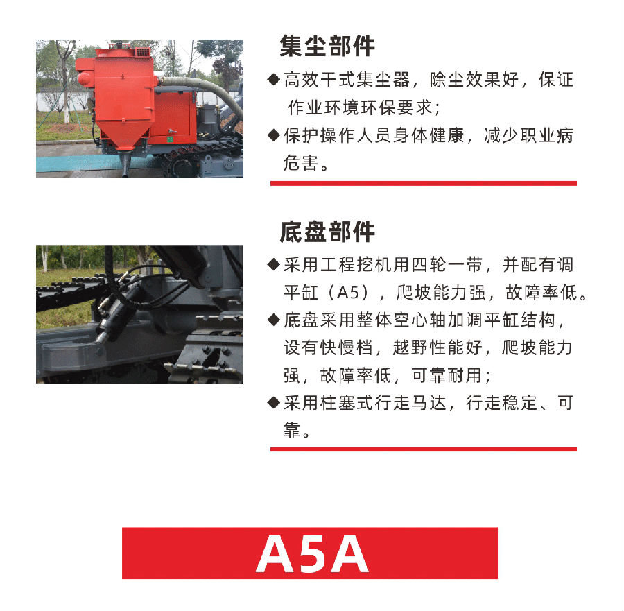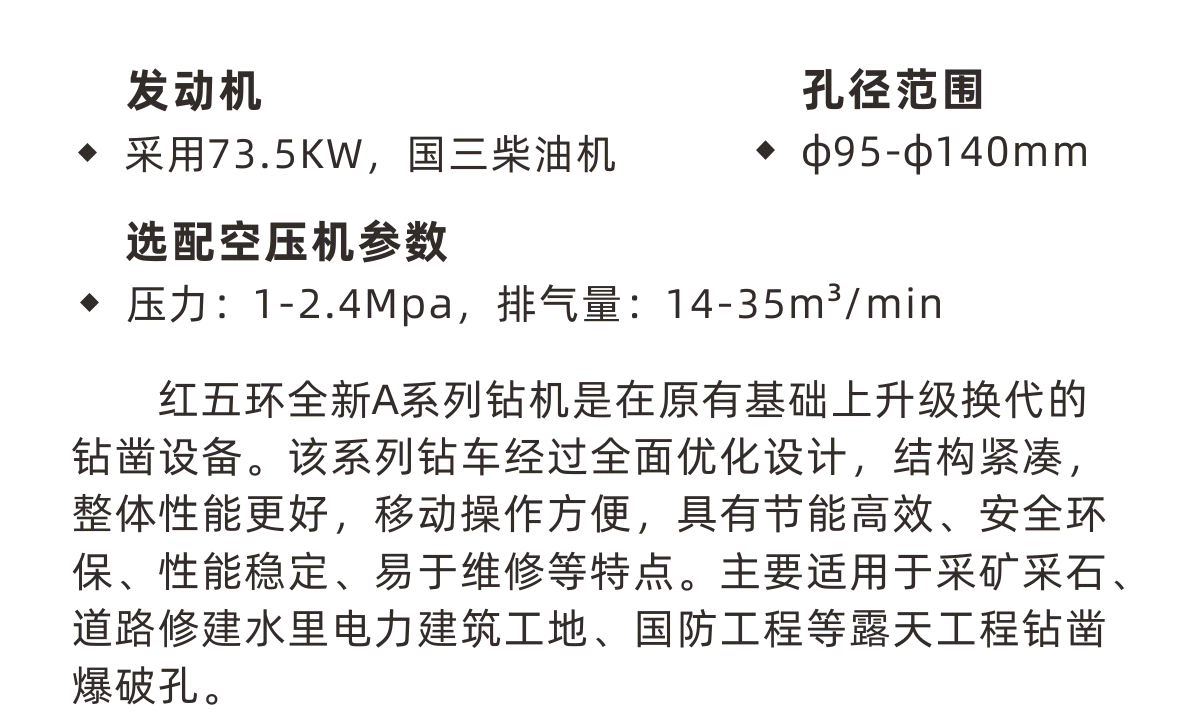 紅五環(huán)全新A系列鉆機(jī)是在原有基礎(chǔ)上升級(jí)換代的鉆鑿設(shè)備。該系列鉆車經(jīng)過(guò)全面優(yōu)化設(shè)計(jì),結(jié)構(gòu)緊湊,整體性能更好,移動(dòng)操作方便,具有節(jié)能高效、安全環(huán)保、性能穩(wěn)定、易于維修等特點(diǎn)。主要適用于采礦采石、道路修建水里電力建筑工地、國(guó)防工程等露天工程鉆鑿爆破孔。