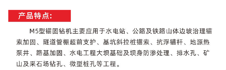 M5錨固鉆車主要應(yīng)用于水電站、公路及鐵路山體邊坡治理錨索加固、隧道管棚超前支護(hù)、基坑斜拉樁錨索、抗浮錨桿、地源熱泵井、路基加固、水電工程大壩基礎(chǔ)及壩身防滲處理、排水孔、礦山及采石場(chǎng)鉆孔、微型樁孔等工程。